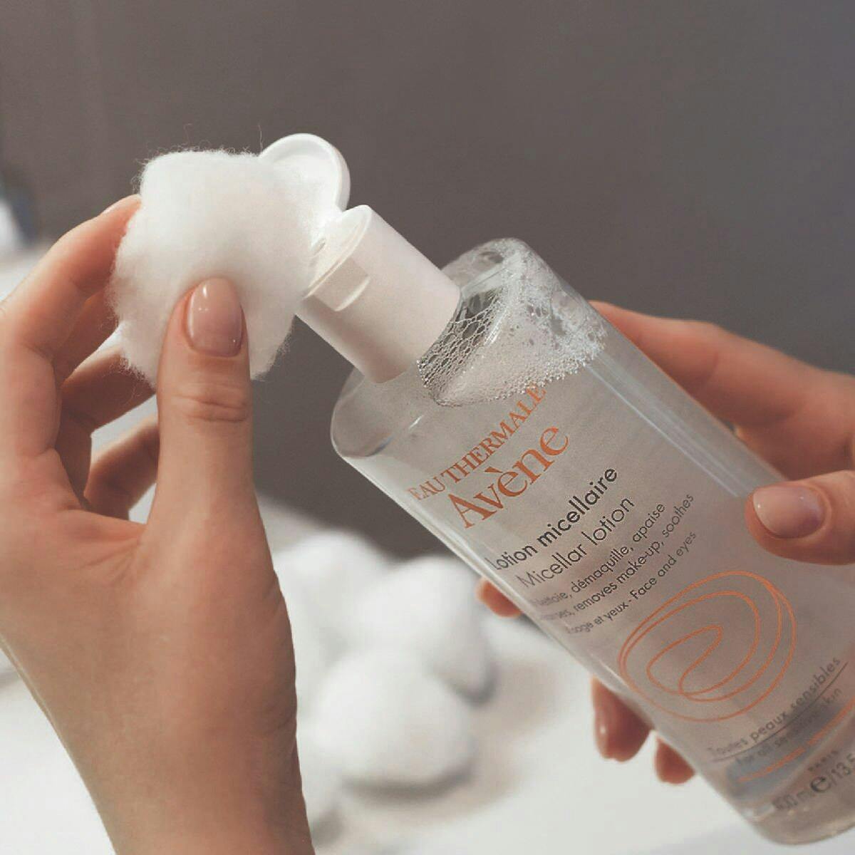 Aplicar la loción micelar sobre un disco de algodón para limpiar o desmaquillar.
